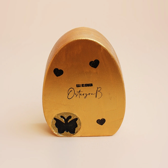 Dieses individuelle Ei ist aus Gießpulver »Raysin 200« mit der Reliefeinlage »Schmetterling« ausgegossen, in gold bemalt und bestempelt. Es ist auf jeder Ostertafel ein Hingucker. Handgefertigt, individuell und in seiner Art einzigartig.