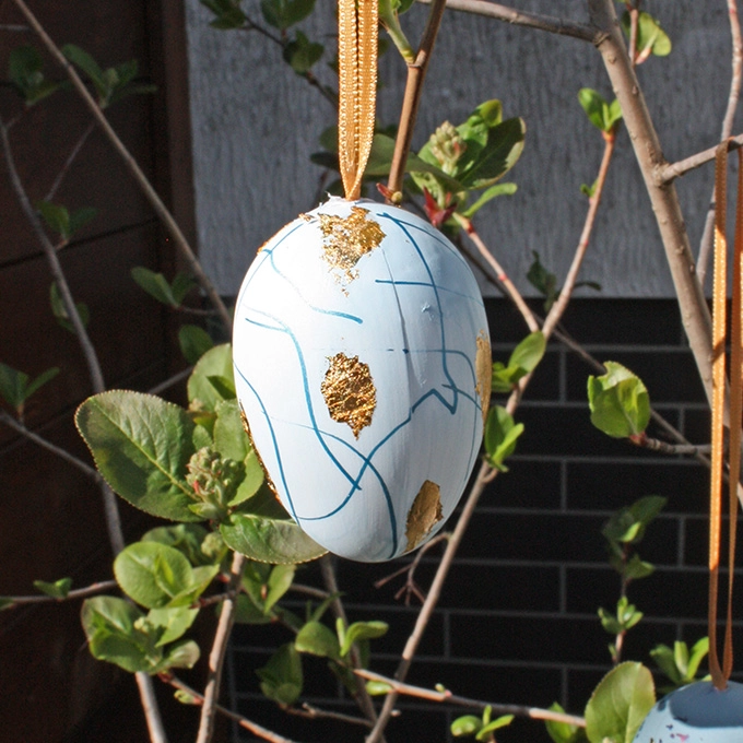 Dieses hübsche Kunstoff-Osterei zum Aufhängen für innen und außen ist handgefertigt und ein toller Begleiter für die Osterzeit. Es lässt sich Ihrer Osterdeko wunderbar kombinieren entweder zum Hängen oder auch als Tischdeko. Das Ei ist mit Kreidefarbe (outdoor) bemalt, mit Metallicfarbstiften und Blattgold verziert.