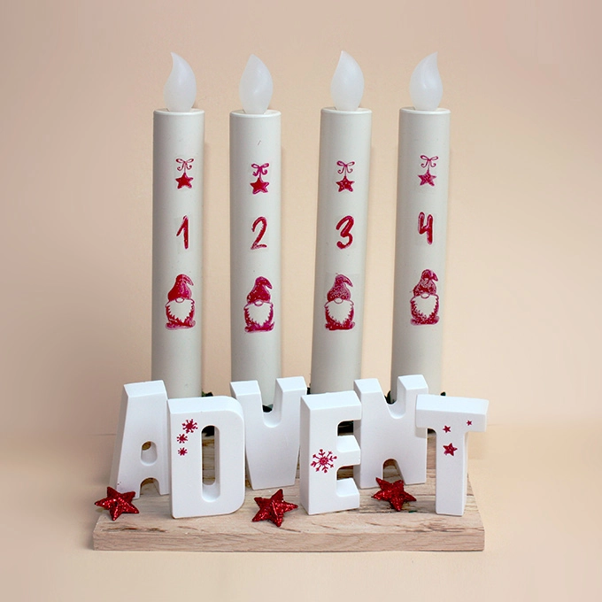 Dieses schöne Adventsgesteck besteht aus 4 LED-Stabkerzen mit Batterien in Kerzenhüllen, einem Holzgestell, einem Schriftzug »Advent« und drei Sternen. Die Kerzen sind mit Zahlen 1-4, einem Wichtel und Stern, die auf eine Wasserschiebefolie gedruckt wurden, veredelt und mit einer Buchsbaumgirlande umrandet.