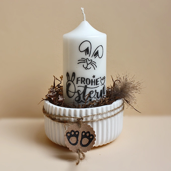Über dieses liebevoll gestaltete Ostergesteck wird man sich bestimmt freuen. Ob als Deko für die eigene Wohnung oder als Geschenk für liebe Menschen. Das Gesteck besteht aus einer Schale aus Raysin mit einer Stumpenkerze, die mit »Frohe Ostern« (auf Transferfolie gestempelt) verziert ist, Dschungelgras, Trockenblumen und Feder. Das Juteband mit dem Schild »Hasenfüße« rundet die Osterschale ab.