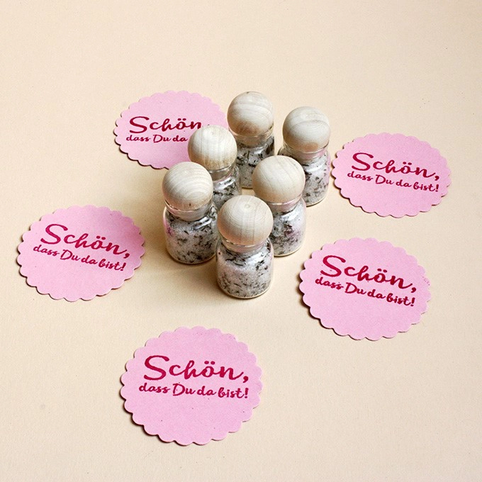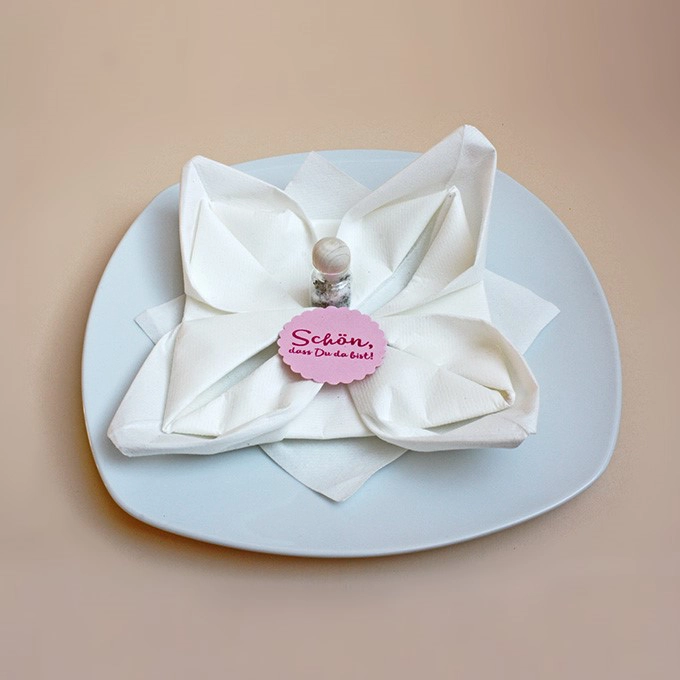 Eine sehr individuelle Tischdekoration ideal für Geburtstage, Taufen, Hochzeiten und anderen Gelegenheiten. Die Gastgeschenke in Form einer kleinen Glasflasche werden mit dem Schild »Schön, dass Du da bist«auf dem Teller mit einer Serviette »Lotusblüte« plaziert.