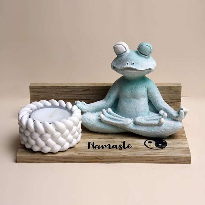 Nicht nur für Yoga-Fans!! Das originell zusammengestellte Ensemble besteht aus einem aus Eichenhölzchen gefertigten Aufsteller bestempelt mit einer Lotusblüte und Namaste, einem Yoga-Frosch aus Raysin 200 sowie einem Kerzenhalter und Teelicht.