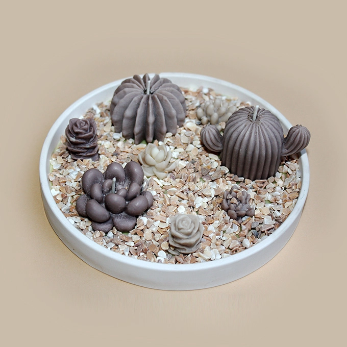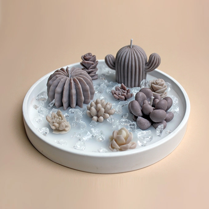 Moderne Homedeko. Dieses kunstvolle Arrangement ist handgefertigt, die Kakteen und Sukkulenten teils als Kerze sind aus 100 % Rapswachs, der Teller aus Raysin 200 verziert mit Glas-Steine.