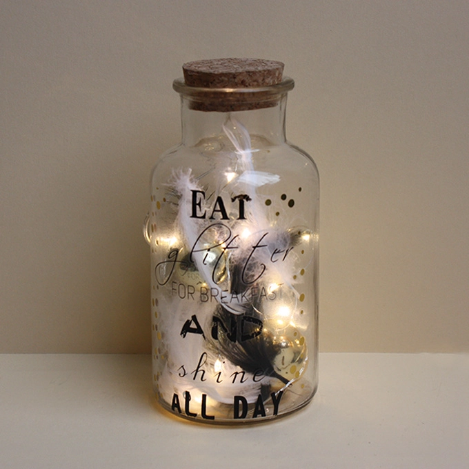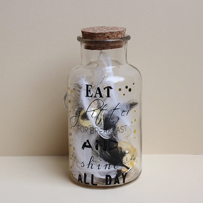 Glasflasche mit Korkdeckel beleuchtet, handgefertigt Maße: Höhe 17 cm Motiv Schrifttzug, Glaskugeln, Federn, 10er LED Lichterkette