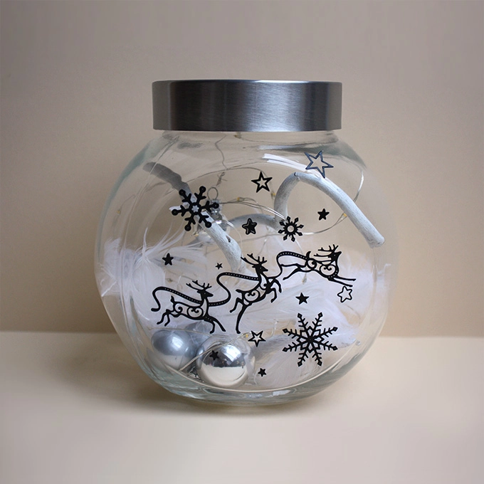 Bonbonglas beleuchetet, handgefertigt Maße: 16 x 3 x 16 cm Motiv Rentierschlitten, weiße Äste, Glaskugeln, Federn, 10er LED Lichterkette