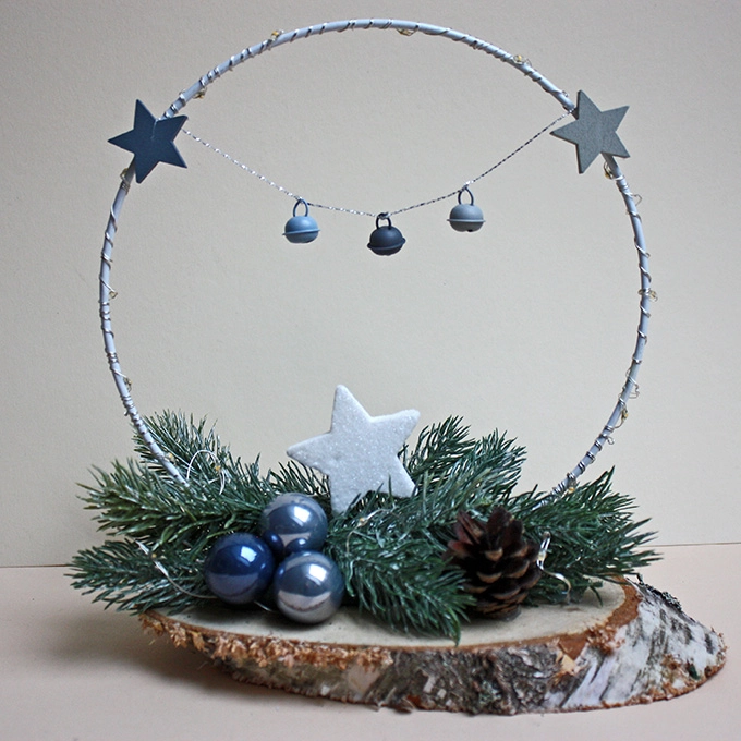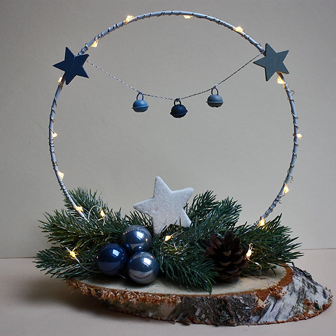 Diese hübsche Weihnachtsdekoration habe ich mit einem weißen Metallring, der mit einer LED-Lichterkette umwickelt ist, gefertigt und mit zwei Holzsternen sowie drei Metallglocken verziert. Sie ist auf einer ovalen Birkenbaumscheibe mit einem Steckziegel befestigt. Dekoriert ist das Gesteck mit Kunsttanne, blauen Glaskugeln, einem weißen Stern und einem Tannenzapfen.