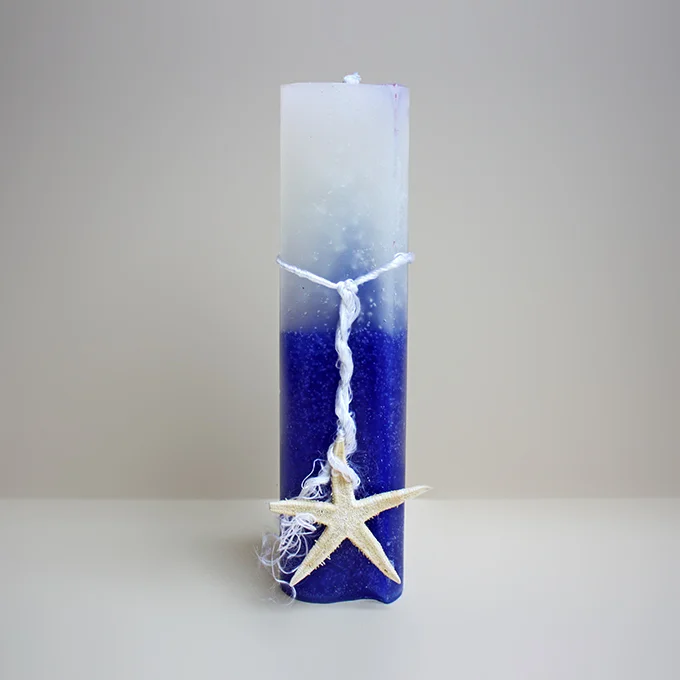 Diese hübsche Dekokerze ist durchgefärbt und von Hand aus Paraffin/Stearin mit einem Baumwolldocht gegossen. Sie hat einn weiß-blauen Farbverlauf und ist mit einer Kordel und Seestern verziert.