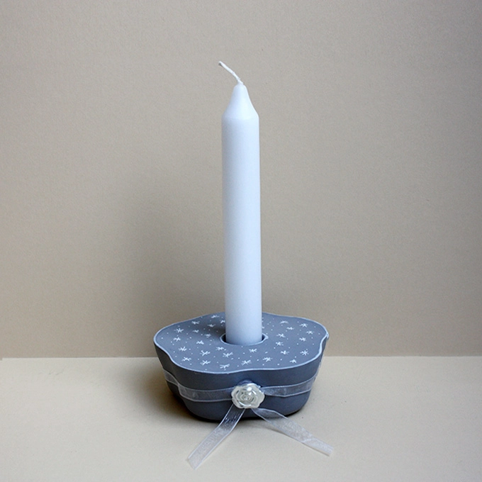 Raysin Gießpulver, Kreidefarbe grau, Organzaband weiß, Rose weiß, Stabkerze