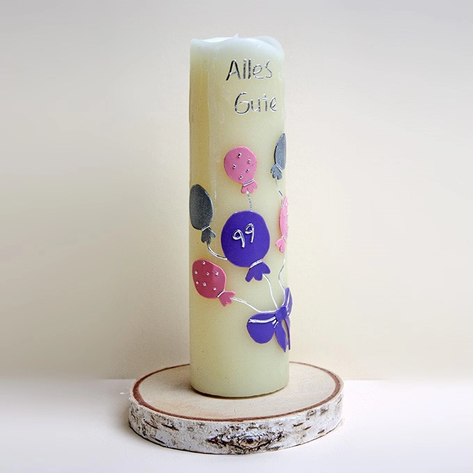 Diese Geburtstagskerze habe ich mit Luftballons und Schleife aus Wachsfolien gefertigt. Die Beschriftung »Alles Gute« ist aus Wachszierstreifen.