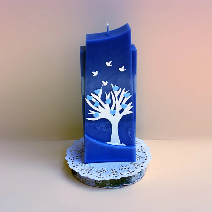 Diese liebevoll gestaltete Kerze »Doppelschwung« ist ein individuelles Hochzeitsgeschenk. Sie ist aus Parafin-Stearinwachs in blau gegossen und mit einem Lebensbaum, Tauben, Herzen verziert.
