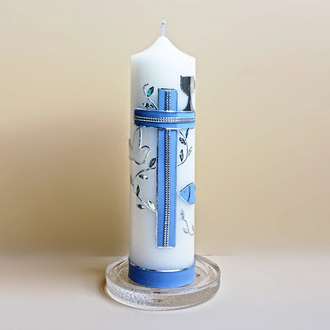 Individuell gestaltete Hochzeitskerze »Glockenspitz» in weiß. Die Verzierungen Kreuz, Fisch Kelch und Blätterranke habe ich in hellblau und silber gefertigt. Hochzeitskerze ist von Hand gefertigt.