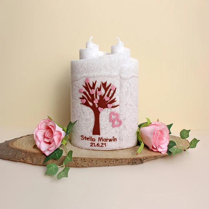 Diese schöne Hochzeitskerze habe ich in aufwendiger Handarbeit gefertigt. Sie ist von beiden Seiten verziert und zeichnet sich durch eine feine kristalline Struktur aus. Der Lebensbaum und die zwei ineinander liegenden Herzen sind von Hand ausgeschnitten, die Herzen auf dem Lebensbaum habe ich ausgestanzt. Die Namen sind aus Wachszierstreifen gefertigt. Auf der Rückseite ist diese Kerze mit einer Blüten-Blätterranke verziert.