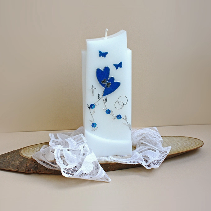 Diese individuelle Hochzeitskerze habe ich mit viel Liebe zum Detail handgefertigt. Sie wurde aus Gießwachs Paraffin/Stearin gegossen. Die Herzen, Blütenranke und Blätter sind aus Wachsfolie ausgeschnitten. Die Blüten, Schmetterlinge und kleine Herzen habe ich ausgestanzt. Das Kreuz ist aus Perlwachsstreifen gemacht.