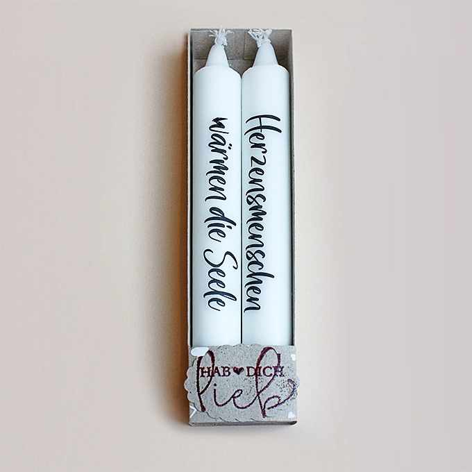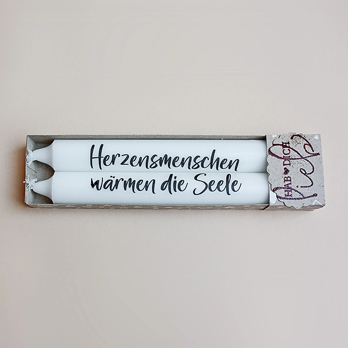 Dieses hübsche Kerzenset bestehend aus zwei Kerzen. Sie sind in einer handgefertigten Schachtel aus Kraftpapier mit weißen Herzen verpackt. Die Kerzen sind aus Stearin und mit einer Wasserschiebefolie »Herzensmenschen wärmen die Seele«beschriftet, die ganz ohne Ruß und Qualm mit der Kerze abbrennt.
