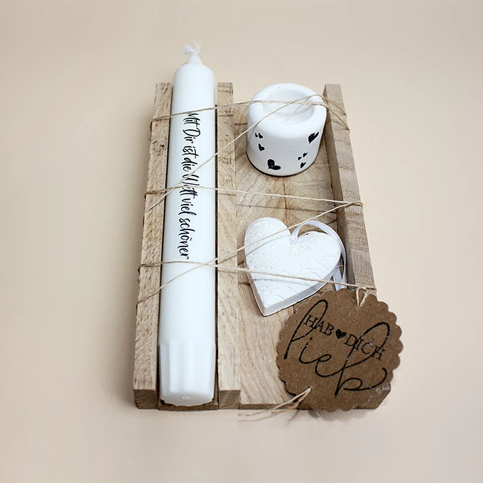 Dieses individuelle Geschenkset bestehend aus einer Stabkerze mit Schriftzug »Mit Dir ist die Welt viel schöner«, einem Herz und einem kleinen Kerzenhalter mit Herzen bedruckt und aus Raysin 200 gegossen. Das Schild »Hab Dich lieb« rundet das Set ab.