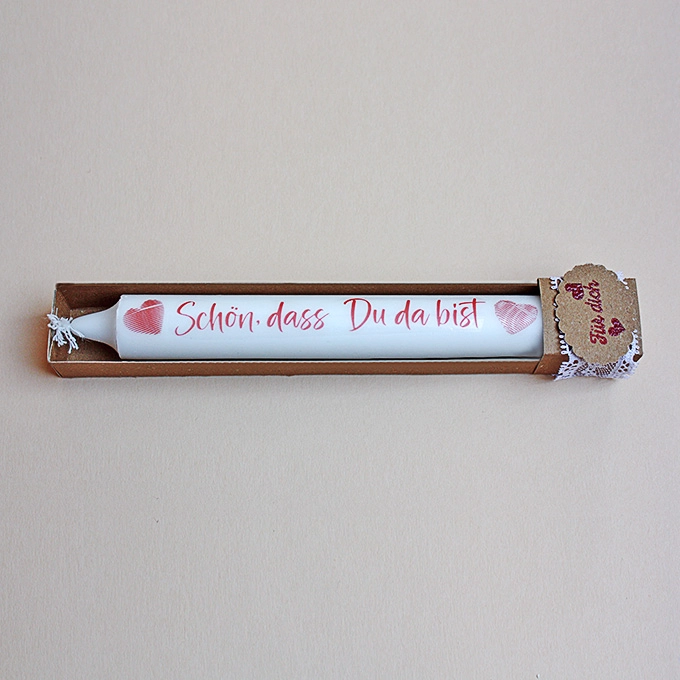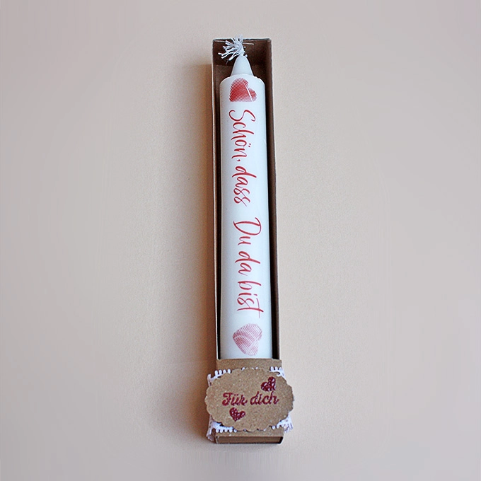 Dieses hübsche Kerzenset lässt sich zu jedem Anlass oder auch ohne verschenken. Die Kerze ist aus Stearin und mit einer Wasserschiebefolie beschriftet, die ganz ohne Ruß und Qualm mit der Kerze abbrennt und ist in einer von Hand gefertigten Schachtel verpackt.