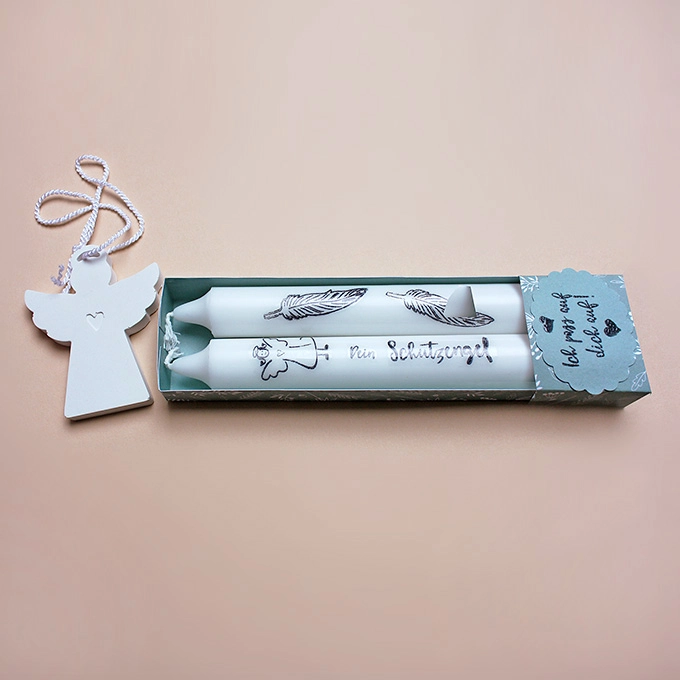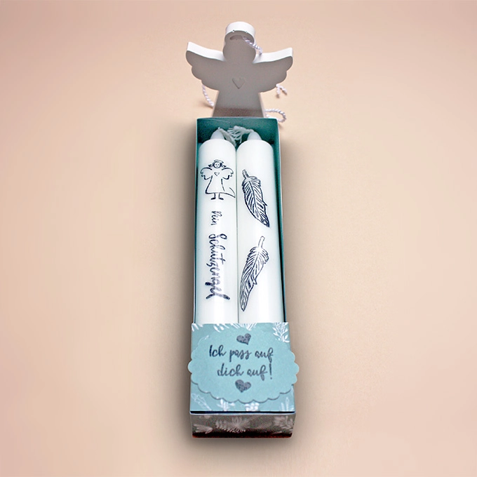 Dieses schöne Kerzenset besteht aus zwei Kerzen und einem Engel, der aus Raysin 200 gegossen wurde. Die Kerzen sind mit einer Wasserschiebefolie beschriftet, die ganz ohne Ruß und Qualm mit der Kerze abbrennt. Sie sind in einer von Hand gefertigten Schachtel aus Designpapier verpackt. Ein tolles Mitbringsel.