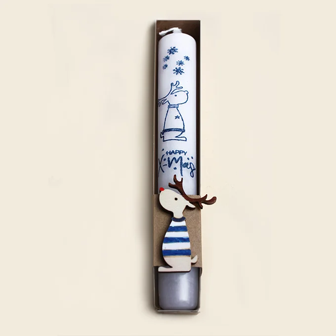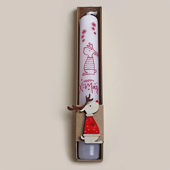 Diese schöne Stabkerze ist ein tolles Mitbringsel ob zum Adventkaffee, als Tischdekoration oder auch nur so. Die Kerze ist mit einer Stempeltransfermethode gestaltet und in einer von Hand gefertigten Schachtel verpackt, die mit einem Holzelch verziert ist.