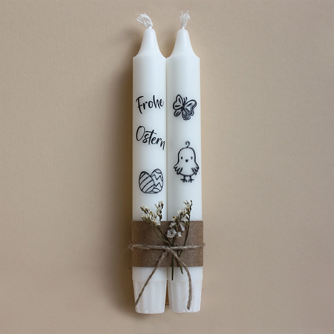 Dieses hübsche Kerzenset ist ein tolles Mitbringsel zum Osterkaffee. Es besteht aus zwei Stabkerzen (Stearin). Die eine ist mit dem Schriftzug Frohe Ostern und Ostereier, die andere mit einem Schmetterling und Küken auf Transferfolie verziert. Die Kerzen sind mit einer Banderole aus Kraftpapier, einem Juteband und Trockenblume umgeben.