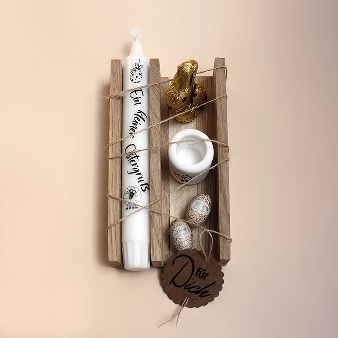 Dieses originelle Geschenkset zu Ostern bestehend aus einer Stabkerze mit Schriftzug »Ein kleiner Ostergruß«, zwei Schokoeier, einem Schokohasen sowie einem kleinen Kerzenhalter mit einem Schmetterling bedruckt. Der Kerzenhalter ist aus Raysin 200 gegossen. Das Schild »Für Dich« rundet das Set ab.
