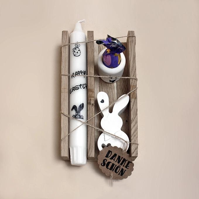 Süßes Geschenkset zu Ostern bestehend aus einer Stabkerze mit Schriftzug »Happy Easter«, einem Schokoei, einem Hasen sowie einem kleinen Kerzenhalter mit Schmetterlingen bedruckt. Der Hase und der Kerzenhalter sind aus Raysin 200 gegossen. Das Schild »Danke schön« rundet das Set ab.