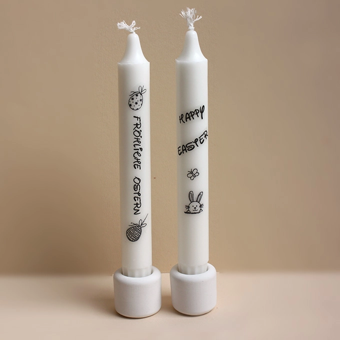 Diese hübschen Osterkerzen sind ein tolles Geschenk/Mitbringsel mit kleiner Botschaft oder einfach mal sich selbst beschenken. Tolle Dekoration für jeden Ostertisch. Die Kerzen sind aus Stearin und mit einer Wasserschiebefolie beschriftet, die ganz ohne Ruß und Qualm mit der Kerze abbrennt. Bitte per Mail mitteilen, welche Stabkerze Sie bestellen möchten.