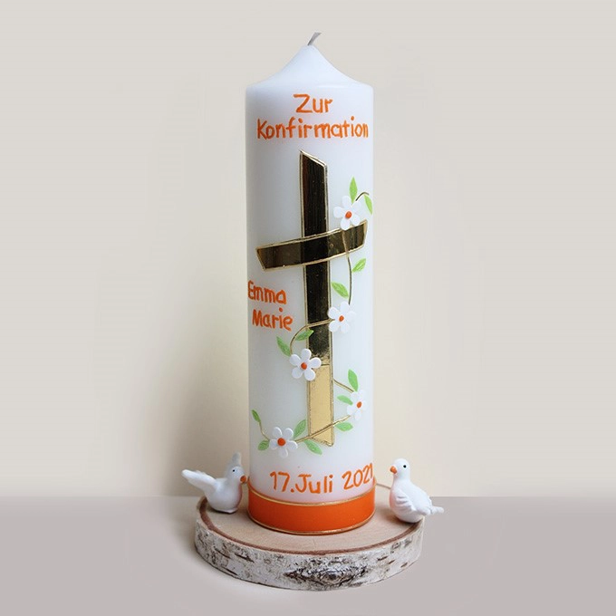 Diese schöne Konfirmations-Kommunionkerze habe ich in aufwendiger Handarbeit gefertigt. Sie ist aus Gießwachs Paraffin/Stearin gegossen. Das Kreuz, die Blütenranke sowie die Beschriftung sind von Hand aus Wachsfolien bzw. Wachszierstreifen gefertigt.