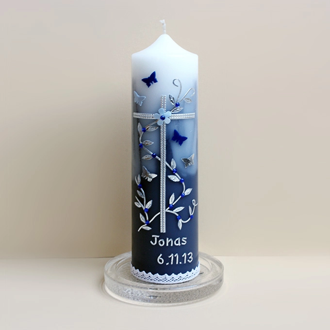Taufkerze, Konfirmationskerze, Kommunionskerze handgefertigt Maße: Größe 20 x 6 cm Glockenspitzkerze blau-weiß verlaufend, Kreuz, Blätterranke, Schmetterlinge, Strasssteine, Spitzenborte, Schriftzug ohne Glasteller
