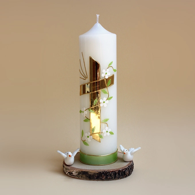 Taufkerze, Konfirmationskerze handgefertigt Maße: Größe 20 x 6 cm Glockenspitzkerze weiß, Kreuz, Blütenranke, Blüten, Schriftzug ohne Holzscheibe und Tauben