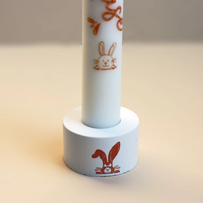 Der Kerzenhalter ist aus Raysin 200 gegossen und mit einem Hasenkopf in orange bzw. schwarz bestempelt. Sollten Sie eine andere Farbe wünschen, dann zögern Sie nicht, mir das mitzuteilen per E-Mail, telefonisch oder über mein Kontaktformular.