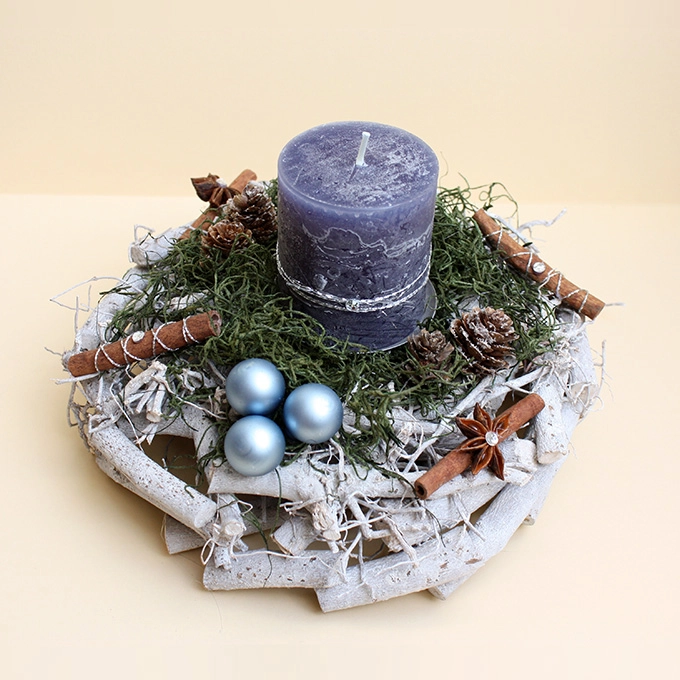 Adventsgesteck aus Wurzelholz, handgefertigt, Maße: 24 x 7 cm Kerze Rustic Blau, Zimstangen, Sternanis, Dschungelmoos, Lärchenzapfen, Glaskugeln blau, Kordel silber, Strassteine