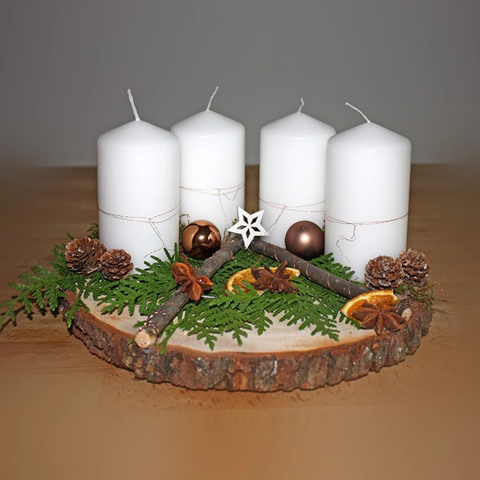 4 Kerzen mit Draht, Orangenscheiben, Glaskugeln, Sternanis, Holzstern, Zapfen, Koniferengrün, Aststücke