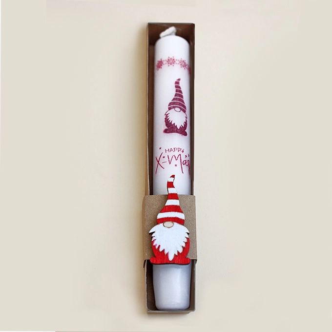 Diese hübsche Stabkerze ist ein tolles Mitbringsel ob zum Adventkaffee, als Tischdekoration oder auch nur so. Die Kerze ist mit einer Stempeltransfermethode gestaltet und in einer von Hand gefertigten Schachtel verpackt, die mit einem Holzwichtel verziert ist.