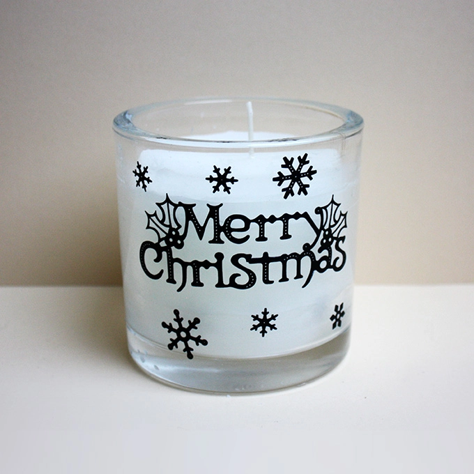 Kerze im Glas mit Schriftzug und Schneeflocken weiß-schwarz, handgefertigt Maße: Durchmesser 10 cm Höhe 10 cm