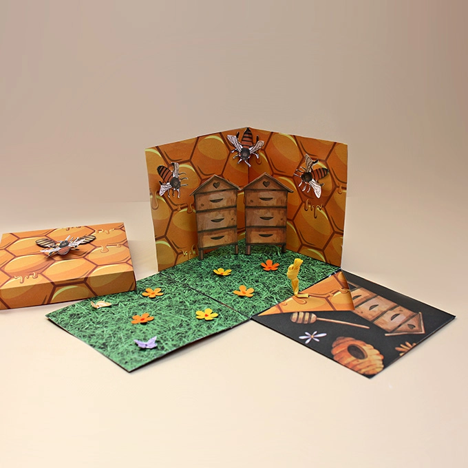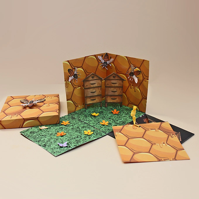 Ich habe diese aus Designpapier gefertigt und mit Bienen, Bienenstöcke und Blumen dekoriert. Die vorgefertigte Tasche kann man für persönliche Glückwunschkarten, Gutscheinkarte bzw. Geld verwenden.