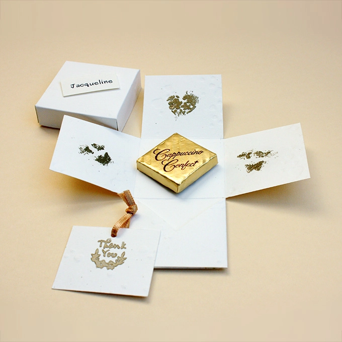 Explosionsbox Dankeschön, Gastgeschenk oderTischkarte (Hochzeit, Taufe Geburtstag) handgefertigt Maße: 5 x 5 cm, Prägekarton Herzen elfenbein, »Thank You«-Karte, Namensschild, Schoki, Verzierungen Schmetterlinge und Herz, Embossing Gold