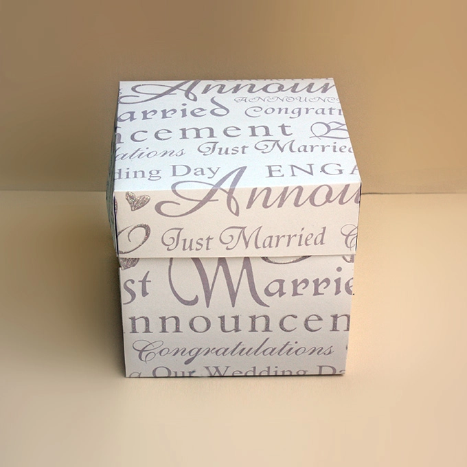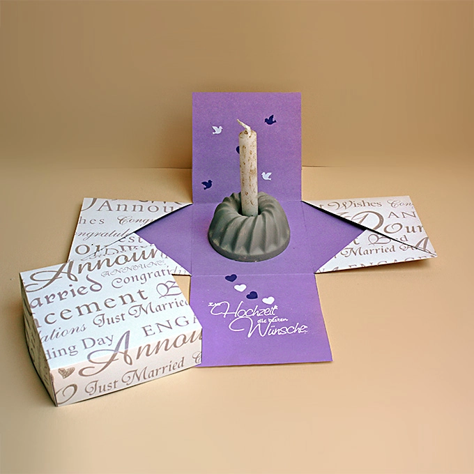 Explosionsbox Hochzeit, handgefertigt Maße: 9,5 x 9,5 x 9,5 cm Designpapier, Kuchenkerzenhalter aus Raysin, Kerze, Herzen, Stempel