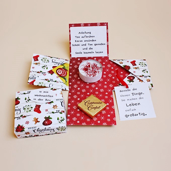 Motivkarton, Teelicht, Schoki, Teebeutel, Spruchkarte, Anleitung