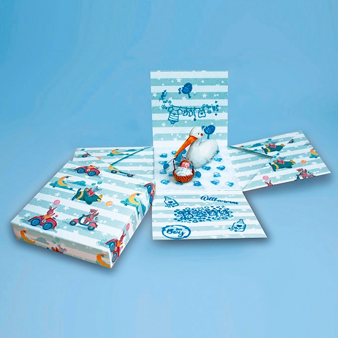 Ich habe diese aus Designpapier gefertigt und mit einem Klapperstorch, einem Baby im Korb, einem Filzteppich mit gestempelten Vögeln und Stempeln dekoriert.