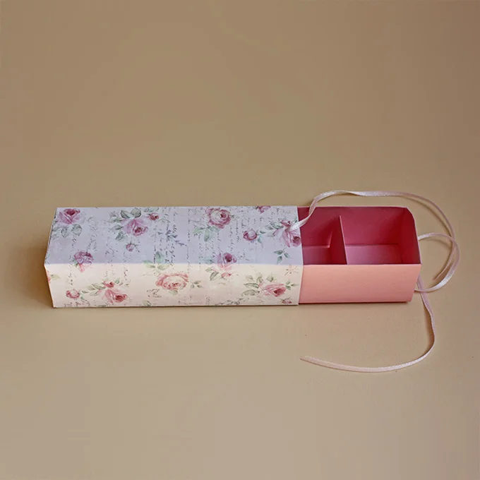 Unikat – Rechteckbox mit 3 Fächern, handgefertigt Maße: Länge 14,5 cm Tiefe 4,5 cm Höhe 3,5 cm Designpapier, Tonpapier, Satinband